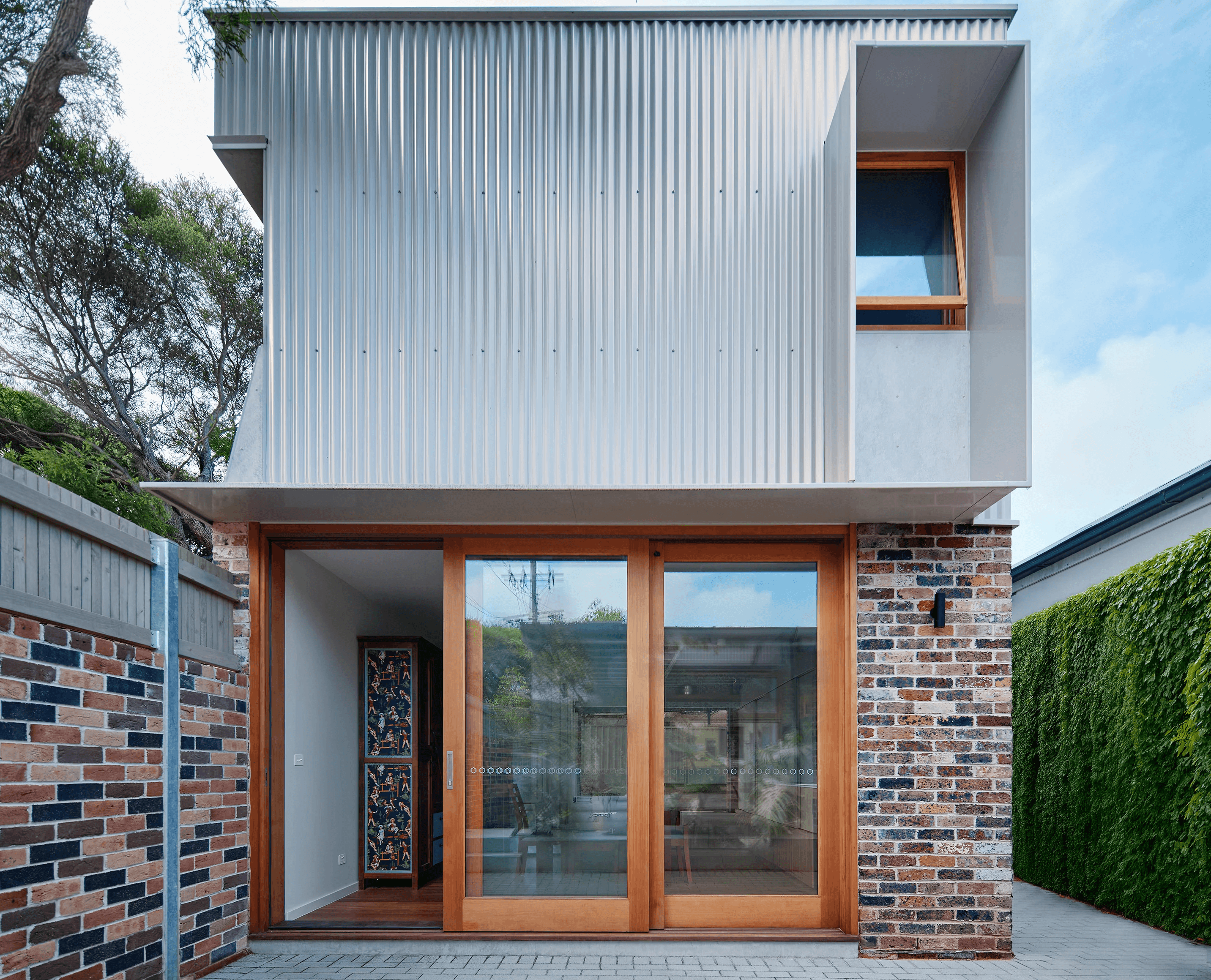 TREE HOUSE Inner West Sydney, NSW An inner-city addition carefully positioned within a mature tree canopy. Set within a leafy street in Sydney’s Inner West, Tree House reimagines a period cottage through a carefully crafted upper-level addition shaped by its relationship with surrounding street trees. Detailed mapping of the existing canopy informed a restrained design that required minimal pruning, allowing the new volume to sit lightly within the branches while drawing filtered natural light into the interiors. The addition emerges from the existing roofline, with corrugated metal folding into the new form while a custom brick blend ties the extension to the original masonry. Living spaces are positioned to engage with the surrounding greenery, creating a quiet dialogue between architecture and landscape. A robust palette of brick, metal, and timber is refined through precise detailing, establishing a calm balance between heritage character and contemporary intervention while preserving valuable urban tree cover.